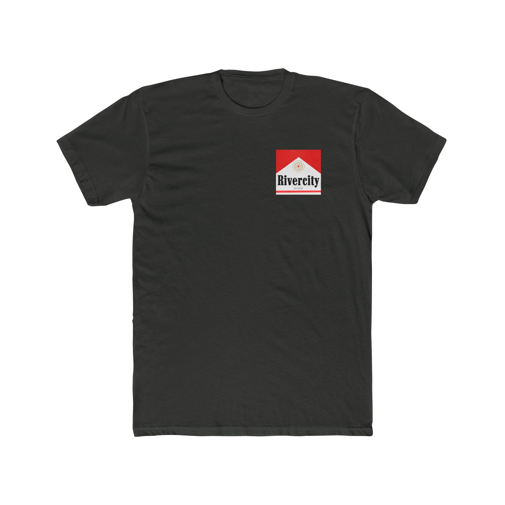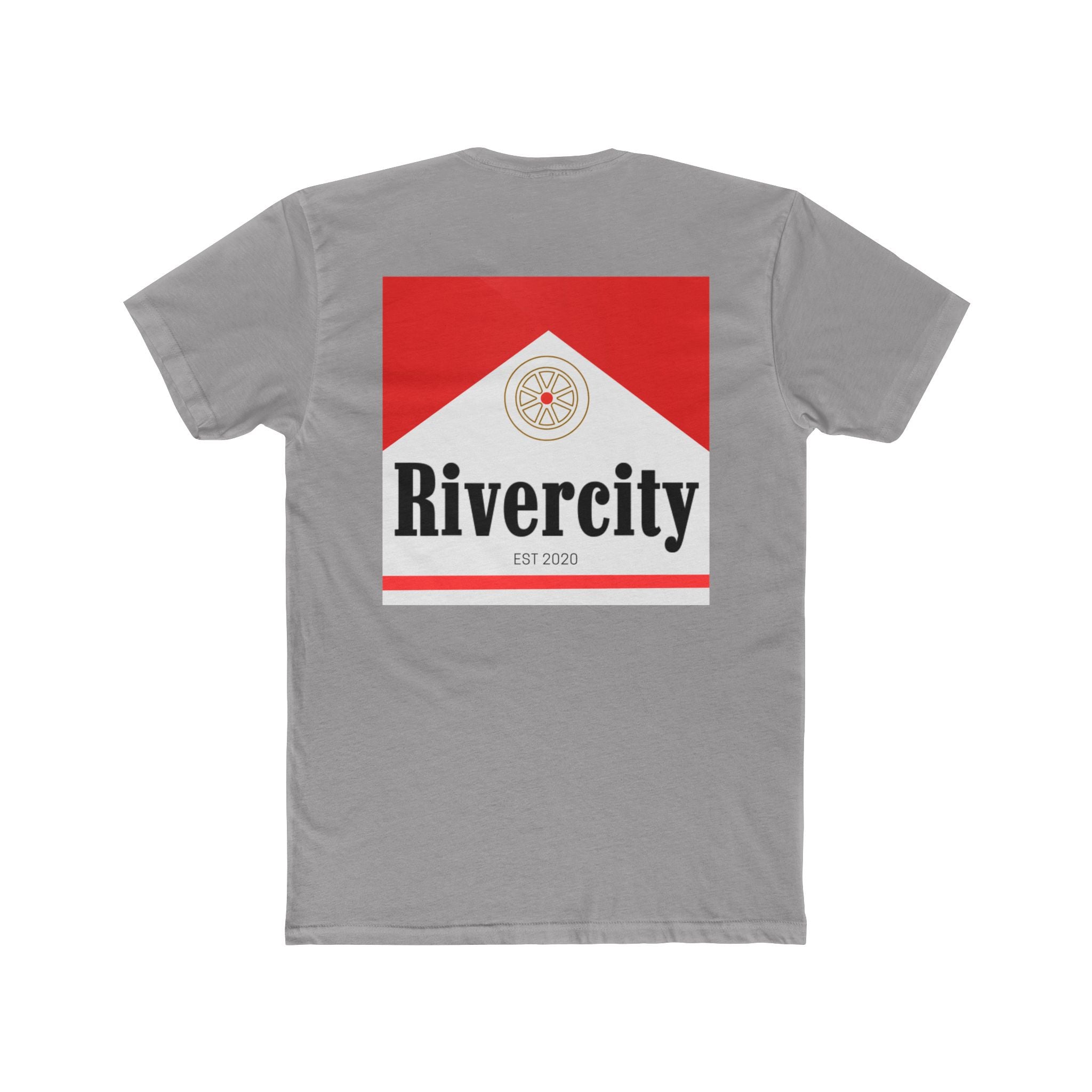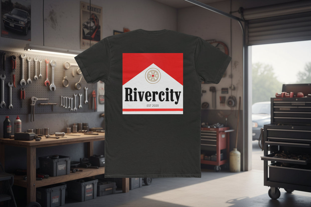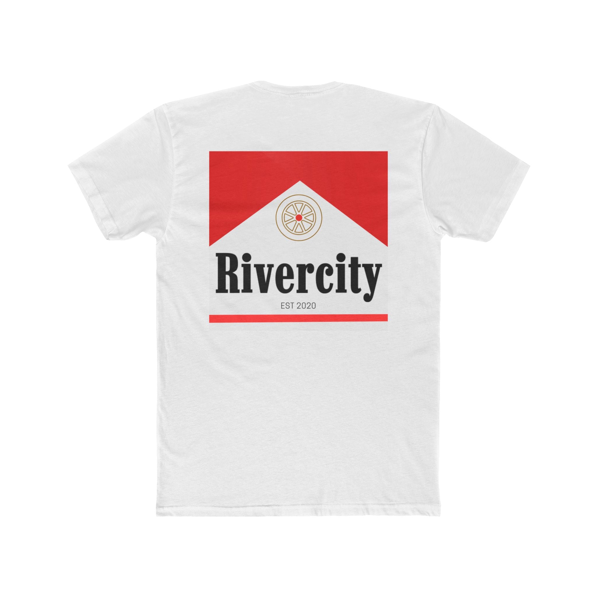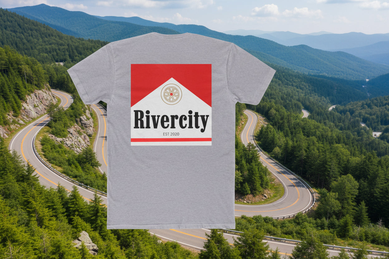 Lightweight and clean—a cotton crew tee that carries a small-town crest with quiet confidence. The Rivercity design sits as a simple badge on the front chest and expands into a bold, geometric logo across the back, marrying vintage collegiate type with a modern, architectural red chevron. Wear it on weekend errands, at low-key river walks, or layered under a jacket for nights around a fire. The fabric breathes and drapes softly, so the print reads clearly without feeling heavy. This shirt feels like a local hangout: familiar, straightforward, and made to move with you.